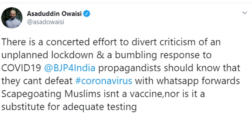 Coronavirus in India: देशभर में कोरोना वायरस के बढ़ते प्रकोप और सोशल मीडिया में फेक न्यूज के प्रसार पर ऑल इंडिया मजलिस-ए-इत्तेहादुल मुस्लिमीन (AIMIM) के प्रमुख असदुद्दीन ओवैसी ने ट्वीट कर भाजपा पर निशाना साधा है। ओवैसी ने मंगलवार (7 अप्रैल, 2020) को ट्वीट कर कहा, बिना योजना बनाए लागू किए गए लॉकडाउन और COVID-19 से नौसिखियों की तरह निपटने की कोशिशों की आलोचना से बचने का मिलाजुला प्रयास किया जा रहा है। भाजपा के प्रचारकों को मालूम होना चाहिए कि वो व्हॉट्सऐप फॉरवर्ड के जरिए कोरोना वायरस को नहीं हरा सकते। ट्वीट में आगे कहा गया कि ‘मुस्लिमों को बलि का बकरा बनाना कोरोना वायरस की दवा नहीं है। ना ही ये पर्याप्त टेस्टिंग का विकल्प हो सकता है।’