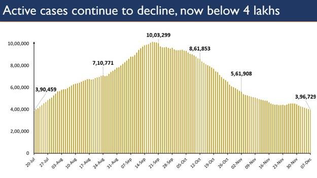 केंद्रीय स्वास्थ्य मंत्रालय ने सोमवार को बताया कि पिछले 140 दिन में देश में यह पहला मौका है जब कोविड-19 के उपचाराधीन मरीजों की संख्या कम होकर चार लाख के नीचे 3,96,729 पर पहुंच गयी है जो कुल संक्रमित मामलों का 4.1 फीसदी है। मंत्रालय ने बताया कि 20 जुलाई को उपचाराधीन मरीजों की संख्या 3,90,459 थी। देश में पिछले 24 घंटे में संक्रमित होने वाले लोगों की संख्या की अपेक्षा संक्रमण मुक्त होने वाले लोगों की तादाद अधिक है और यह चलन पिछले दस दिन से जारी है । इस अवधि में देश में संक्रमण के 32,981 नए मामले सामने आए हैं जबकि 39,109 लोग स्वस्थ हुए हैं।