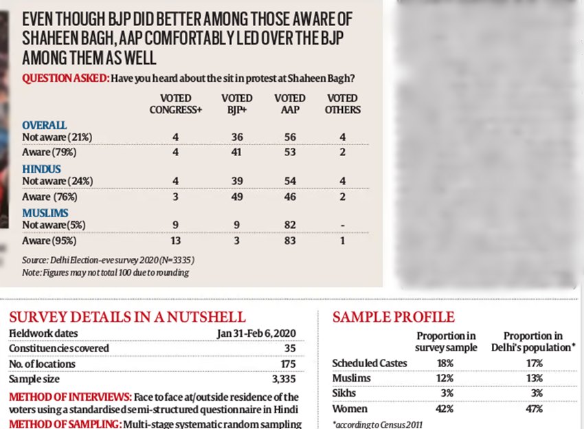 सर्वे में पाया गया कि करीब 79 प्रतिशत मतदाता शाहीन बाग प्रदर्शन के बारे में अवगत थे और 21 प्रतिशत नहीं थे। जो लोग शाहीन बाग के बारे में जान रहे थे, उनमें से 4 प्रतिशत ने कांग्रेस, 41 प्रतिशत ने बीजेपी, 53 प्रतिशत ने आप और 2 प्रतिशत ने अन्य को वोट दिया। जिन्हें इस प्रदर्शन के बारे में जानकारी नहीं थी, उन 21 प्रतिशत लोगों में से 4 प्रतिशत ने कांग्रेस, 36 प्रतिशत ने बीजेपी, 56 प्रतिशत ने आप और 4 प्रतिशत ने अन्य को वोट दिया।