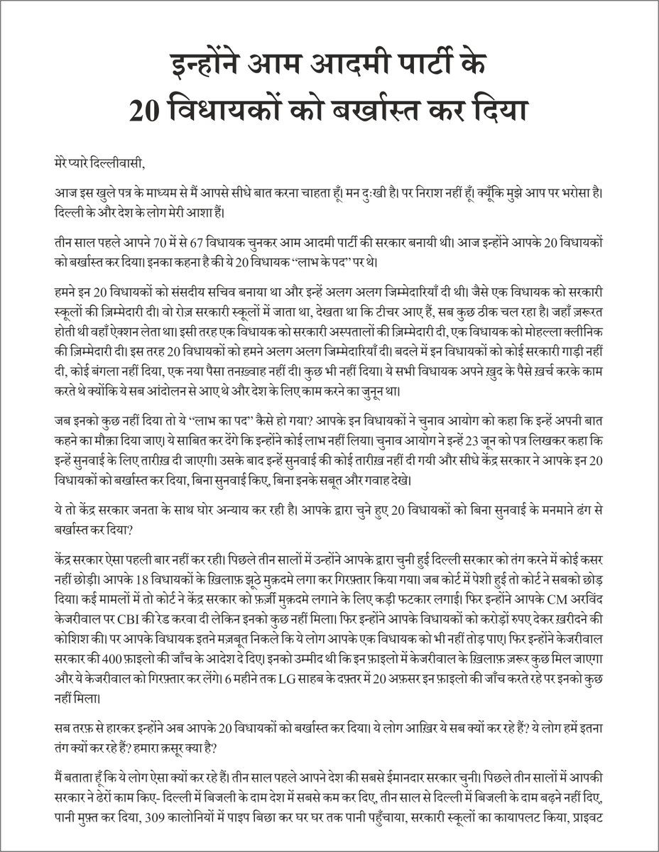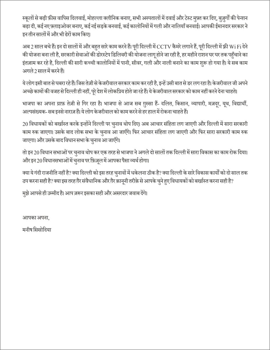 सिसोदिया ने पत्र की शुरुआत करते हुए लिखा है, “आज इस खुले पत्र के माध्यम से मैं आपसे सीधे बात करना चाहता हूं। मन दु:खी है। पर निराश हूं क्योंकि मुझे आप पर भरोसा है। दिल्ली के और देश के लोग मेरी आशा हैं। तीन साल पहले आपने 70 में से 67 विधायक चुनकर आम आदमी पार्टी की सरकरा बनाई थी। आज इन्होंने आपके 20 विधायकों को बर्खास्त कर दिया। इनका कहना है कि ये 20 विधायक लाभ के पद पर थे। हमने इन्हें संसदीय सचिव बनाया था और अलग-अलग जिम्मेदारियां दी थीं। इनके काम की वजह से दिल्ली के स्कूलों, अस्पतालों में आश्चर्यजनक सुधार हुआ।” सिसोदिया ने लिखा है कि जब इन विधायकों को सरकार ने कोई सरकारी गाड़ी नहीं दी, बंगला नहीं दिया, एक नया पैसा तनख्वाह नहीं दी। कुछ भी नहीं दिया। ये सभी अपने पैसे खर्च कर रहे थे। जब इन्हें कुछ दिया ही नहीं तो लाभ का पद कैसे हो गया।