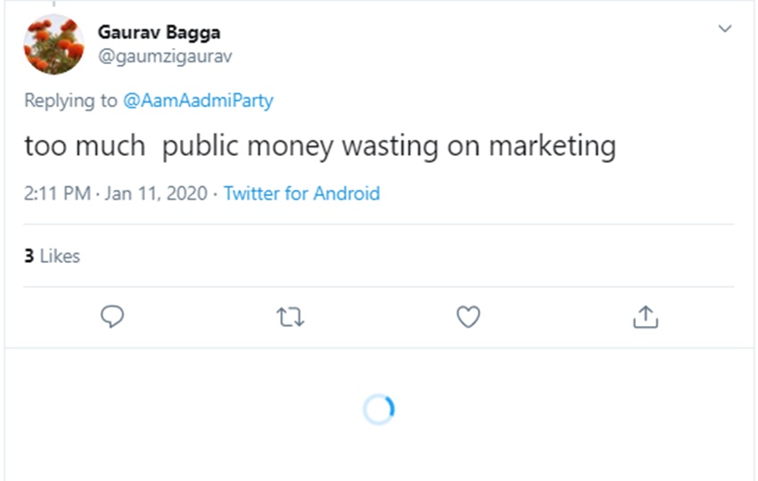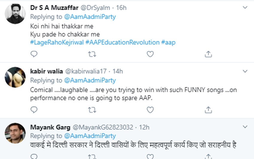 पार्टी के इस कैंपेन सॉन्ग को ट्विटर पर कई लोगों ने देखा और सुना है तथा अपनी प्रतिक्रिया भी दी है। गौरव बग्गा नाम के एक ट्विटर यूजर ने लिखा है कि ‘मार्केटिंग पर जनता के काफी पैसे बर्बाद किये जा रहे हैं।’ एक यूजर ने इसपर मौज लेते हुए लिखा कि ‘सारी दिल्ली बोले भाग भाग पलटीमार..तुम किसी के सगे नही हो केजरीवाल।’ एक यूजर ने लिखा कि ‘केजरीवाल जी कन्हैया कुमार की फाइल क्यों दबा रखी है?? उस पर साइन करो। और पुलिस को अपना काम करने दो। नक्सलियों का संरक्षण करना बंद करो। बाकी वैसे भी मुफ्तखोरों के अलावा तुम्हें कोई वोट नहीं देगा।’
