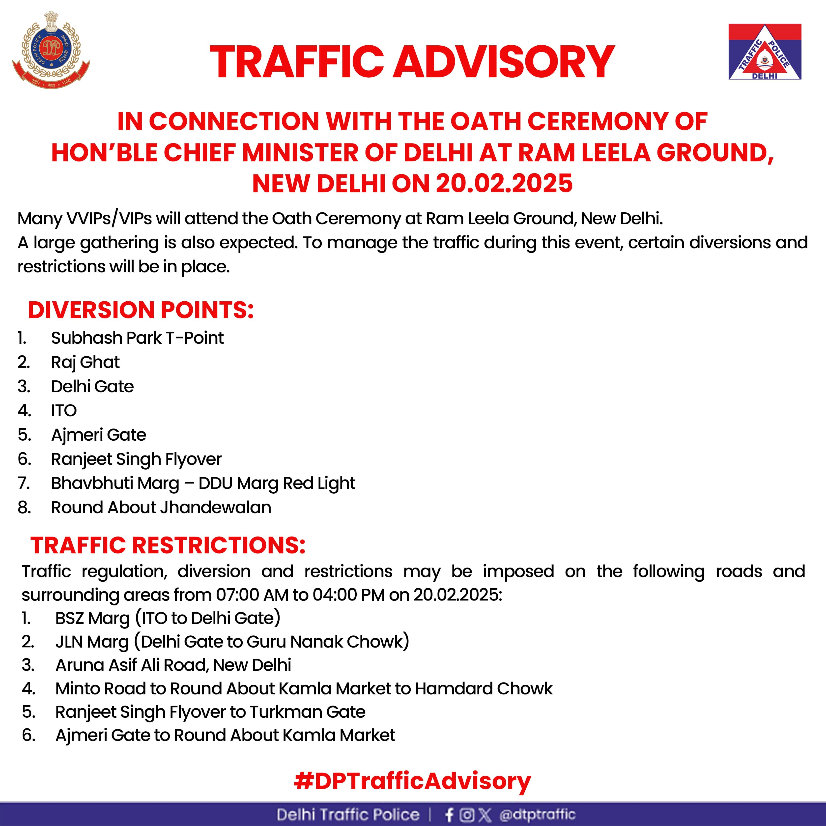 दिल्ली पुलिस ने भी 20 फरवरी को होने वाले शपथ ग्रहण को लेकर एडवायडरी जारी की है। दिल्ली के कई रास्ते इस दौरान बंद रहेंगे। अगर आपको गुरुवार को इन रास्तों से निकलना है तो यह एडवायजरी जरूर पढ़ें।