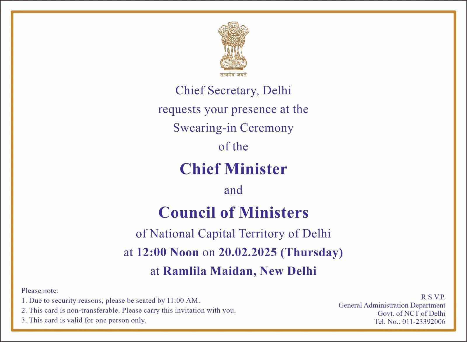 दिल्ली के नए मुख्यमंत्री के शपथ ग्रहण समारोह का निमंत्रण पत्र लोगों को पहुंचने शुरू हो गए हैं। दिल्ली के नए सीएम और उनका मंत्रीपरिषद कल दोपहर 12 बजे रामलीला मैदान में शपथ लेंगे।