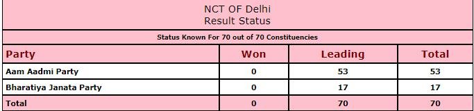 चुनाव आयोग की वेबसाइट के मुताबिक दोपहर 1:18 बजे तक की मतगणना के मतगणना के मुताबिक आप के 57 उम्मीदवारों ने बढ़त बना ली है जबकि भाजपा के 13 उम्मीदवार आगे हैं। पिछले चुनाव में एक भी सीट ना जीतने वाली कांग्रेस को भी इस बार खराब प्रदर्शन से जूझना पड़ रहा है।