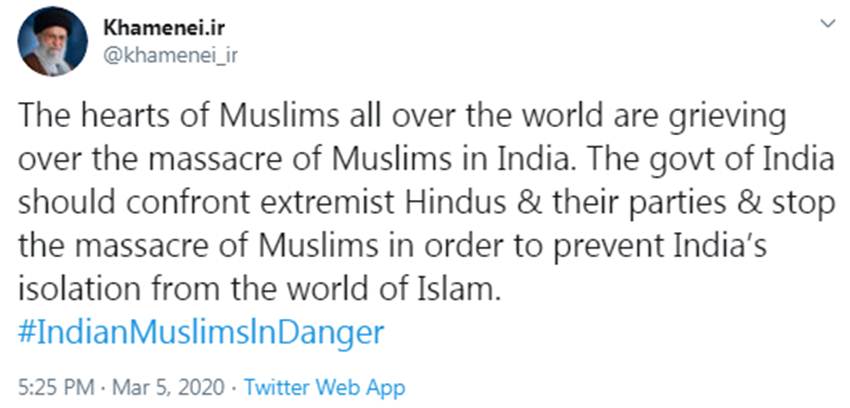 खामनेई ने ट्वीट किया, ‘‘भारत में मुसलमानों के नरसंहार से दुनियाभर में मुसलमान दुखी हैं। भारत सरकार को कट्टरपंथी हिंदुओं और उनकी पार्टियों को रोकना चाहिए तथा इस्लामी जगत से भारत को अलग-थलग पड़ने से बचाने के लिए मुसलमानों के नरसंहार को रोकना चाहिए।’’