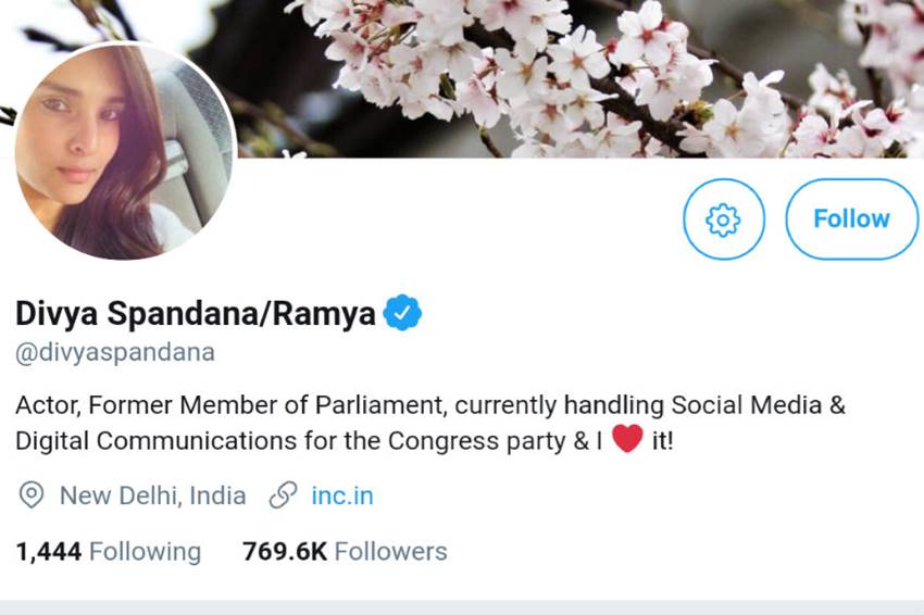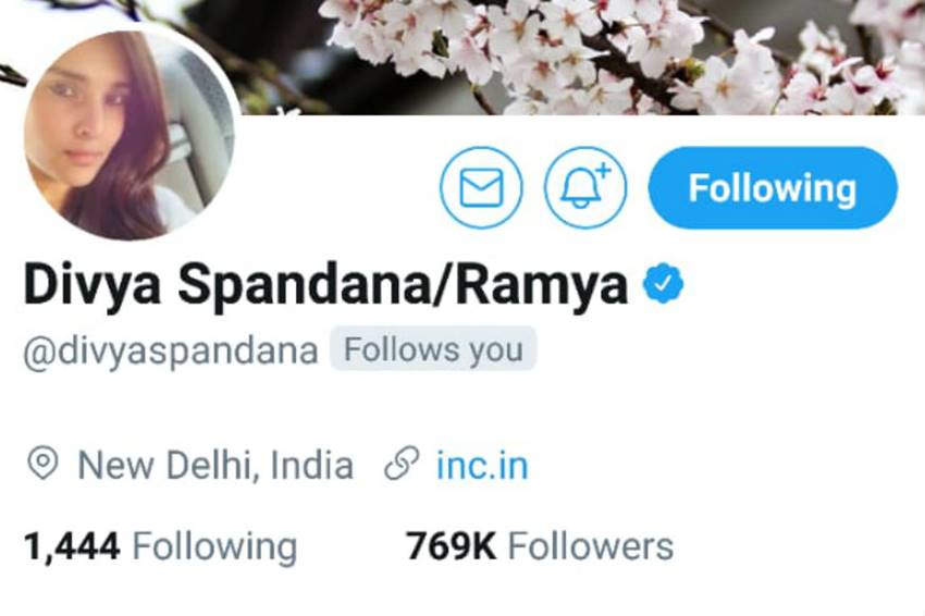 राम्या 29 सितंबर से ट्विटर पर नहीं दिख रही थी। अब एक बार फिर उन्होंने मोर्चा संभाल लिया है। वह मई 2017 में कांग्रेस की सोशल मीडिया हेड बनी थी तब से पार्टी की ट्विटर टाइमलाइन में चमक देखी गई है। रिपोर्ट्स के मुताबिक ट्विटर बायो बदलने के सवाल पर राम्या ने कहा कि वह छुट्टियों पर थीं और इसबारे में उन्होंने पार्टी नेता रणदीर सुरजेवाला को अवगत करा दिया था।