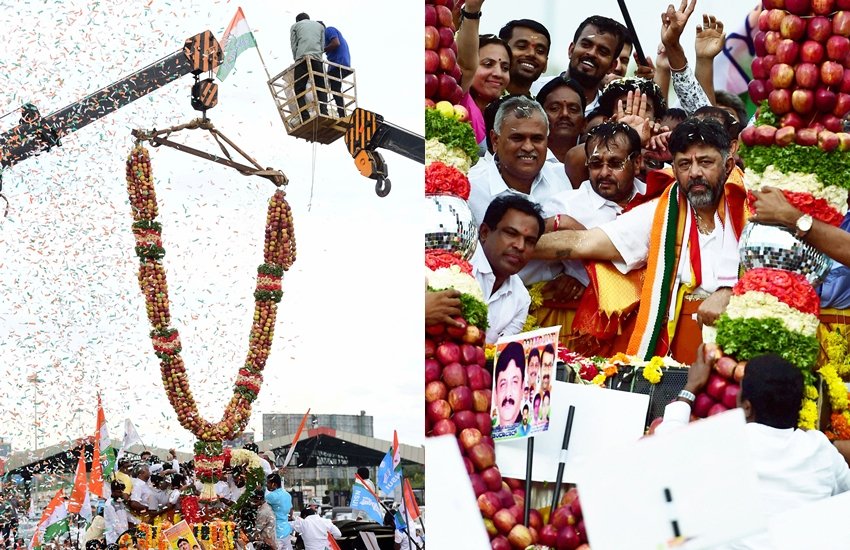 मनी लॉन्ड्रिंग केस में जेल से जमानत पर बाहर आए कांग्रेस के सीनियर नेता डीके शिवकुमार के बेंगुलरू पंहुचने पर कार्यकर्ताओं ने 250 किलो की सेब की माला से स्वागत किया गया। इस माला को दो क्रेनों के जरिए लिफ्ट किया गया। इस दौरान उनके स्वागत में जनता दल-सेक्युलर (जेडीएस) नेता और पूर्व मुख्यमंत्री एचडी कुमारस्वामी भी मौजूद रहे। इस दौरान हवाई अड्डे के बाहर सैकड़ों कार्यकर्ताओं और समर्थक मौजूद थे।