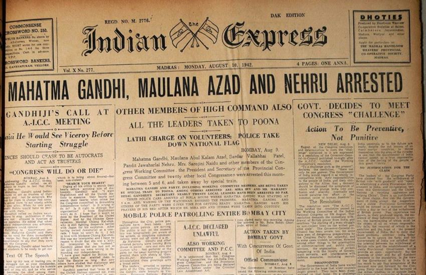 हालांकि आंदोनल शुरू होने के कुछ दिनों बाद महात्मा गांधी और कांग्रेस के बड़े नेता जवाहरलाल नेहरू, वल्लभ भाई पटेल को गिरफ्तार कर लिया है। 10 अगस्त, 1942 को अंग्रेजी अखबार द इंडियन एक्सप्रेस ने भी इस खबर को प्रमुखता से छापा था। अखबार लिखता हैं, ‘महात्मा गांधी, मौलाना आजाद और नेहरू गिरफ्तार।’ अखबार आगे लिखता है कि ‘कांग्रेस के अन्य सदस्यों की बड़े पैमाने पर गिरफ्तारी’।