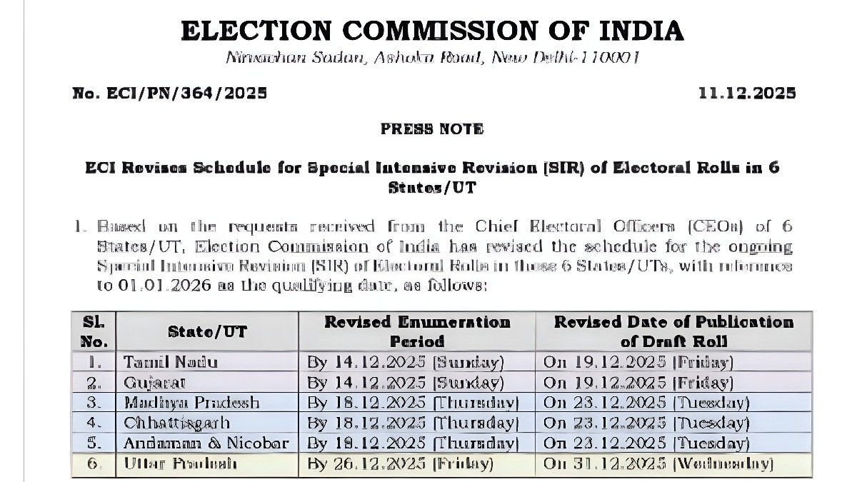 बता दें कि इन 6 राज्यों और केंद्रशासित प्रदेशों के लिए गिनती का समय 11 दिसंबर 2025 तक था इलेक्टोरल रोल पब्लिश होने की तारीख 16 दिसंबर 2025 थी। गोवा, गुजरात, लक्षद्वीप, राजस्थान और पश्चिम बंगाल के लिए गिनती का समय 11 दिसंबर तक है। इन राज्यों में ड्राफ्ट इलेक्टोरल रोल 16 दिसंबर 2025 को पब्लिश किए जाएंगे।