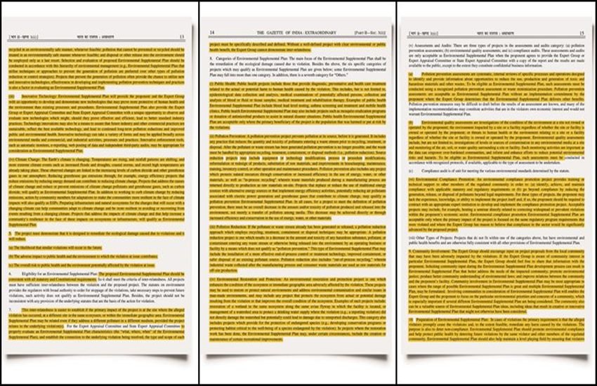 India (Clause 1): An Environmental Supplemental Plan (ESP) is an environmentally beneficial project or activity that is not required by law, but that an alleged violator of Environmental Impact Assessment Notification, 2006 agrees to undertake as part of the process of environmental clearance.