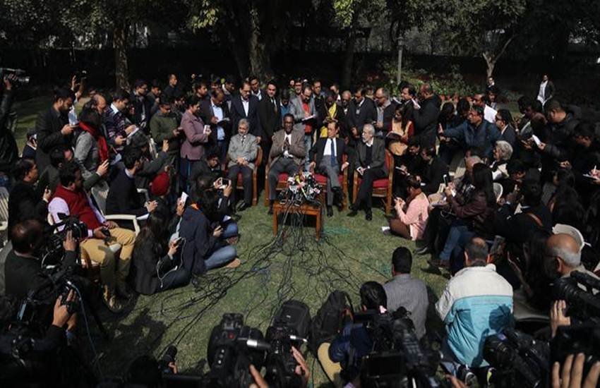 दोपहर 12:16: चारों जज लॉन में पहुंच गए। एक कॉफी टेबल पर माइकों को रख दिया गया था, ताकि उनकी आवाज ठीक से सुनाई दे सके। शुरुआत में जस्टिस चेलामेश्वर की आवाज सुनाई नहीं पड़ी थी। उन्होंने उसे दोहराते हुए कहा था, ‘सुप्रीम कोर्ट का प्रशासन सही तरीके से नहीं चल रहा है। पिछले कुछ महीनों में कई ऐसी बातें हुईं जो नहीं होनी चाहिए थीं।’ सभी जज जब आपस में बात कर रहे थे तो कुछ पत्रकार उनके करीब पहुंच गए थे। इस पर जस्टिस चेलामेश्वर को हस्तक्षेप करना पड़ा था।