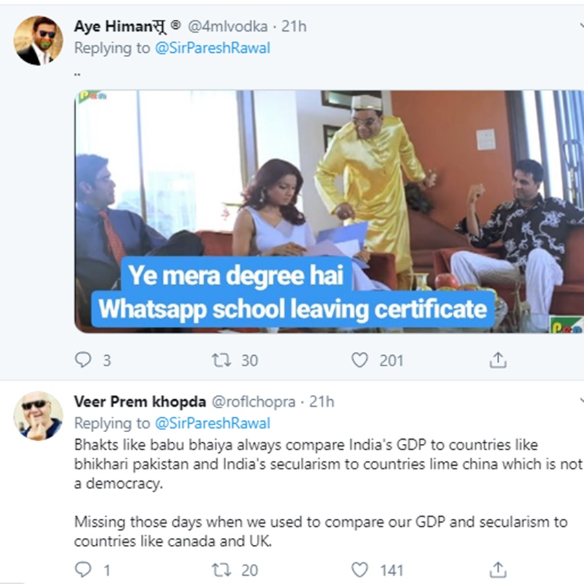 परेश रावल के इस ट्वीट के बाद अब यूजर्स उनके ज्ञान पर चुटकी लेने लगे हैं। डॉक्टर उज्मा रज़्वी नाम के एक यूजर ने लिखा कि ‘येल विश्वविद्यालय से ग्रेजुएट हैं…या फिर वो भूगोलशास्त्र में मोदी जी के क्लासमेट होंगे।’ बंटी त्रिपाठी नाम के एक यूजर ने लिखा कि ‘म्यनमार से चीन की दूरी 2174 किलोमीटर है और सड़क से यह दूरी 4154 किलोमीटर हो जाती है। व्हाट्सऐप यूनिवर्सिटी के पढ़े लोगों के मैसेज शेयर करोगे तो ऐसे ही बेइज्जती होगी।’ सिम्मी आहूजा नाम की एक यूजर ने पूर्व सांसद को फैक्ट्स चेक करने की नसीहत दी है। एक यूजर ने लिखा कि ‘ऐसा लगता है कि ‘वो अरुणाचल प्रदेश और भारत के अन्य नॉर्थईस्ट के राज्यों को इसमें जोड़ना भूल गए।’ एक यूजर ने एक्टर पर निशाना साधते हुए लिखा कि ‘बाबू भईया…व्हाट्सऐप कम इस्तेमाल करो…बेवकूफी का और कितना सबूत दोगे’