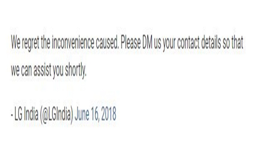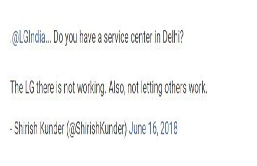 हालांकि शिरीष कुंदर के इस मजाकिया ट्वीट को एलजी इलेक्ट्रॉनिक्स ने पूरी गंभीरता और तत्परता के साथ लिया। एलजी इलेक्ट्रॉनिक्स ने तत्काल पलटकर जवाब दिया कि वह थोड़ी ही देर में उन्हें आवश्यक मदद उपलब्ध कराने के लिए तैयार हैं। एलजी इलेक्ट्रॉनिक्स ने लिखा,” हम आपको हुई असुविधा के लिए क्षमाप्रार्थी हैं। कृपया अपने संपर्क की जानकारी हमें दें जिससे हम जल्दी ही आपकी मदद कर सकें। इस मजेदार संवाद ने कई लोगों को ठहाके लगाने के लिए मजबूर कर दिया।