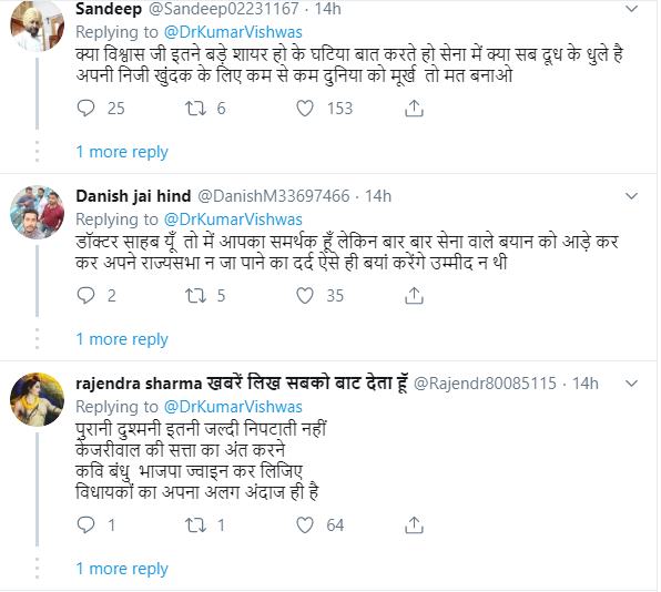 केजरीवाल पर कुमार विश्वास के ट्वीट पर सोशल मीडिया ने यूजर्स ने भी अपनी प्रतिक्रिया दी है। कई यूजर्स ने उनके ट्वीट को राज्यसभा भेजे जाने के तंज के रूप में देखा। हालांकि कुछ ट्वीट आप समर्थित यूजर्स ने भी किए।