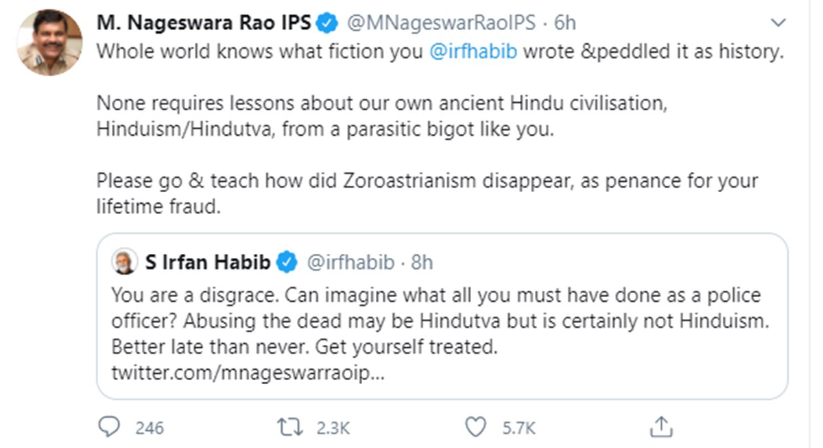 बता दें कि पूर्व आईपीएस अधिकारी पहली बार अपने ट्वीट को लेकर लोगों के निशाने पर नहीं आए हैं। इससे पहले भी इस साल जुलाई में एम.नागेश्वर राव ने एक ट्वीट किया था, जिसमें उन्होंने हिंदू सभ्यता पर पाश्चात्य सभ्यता थोपने का आरोप लगाया था। इस ट्वीट में राव ने लिखा था कि “हिंदुओं के ज्ञान को नकारा गया। हिंदुत्व को अंधविश्वासी कहकर प्रचारित किया गया। शिक्षा व्यवस्था को पाश्चात्य किया गया। मीडिया और मनोरंजन के साथ भी ऐसा ही किया गया। हिंदुओं को उनकी पहचान को लेकर शर्म महसूस करायी गई।”