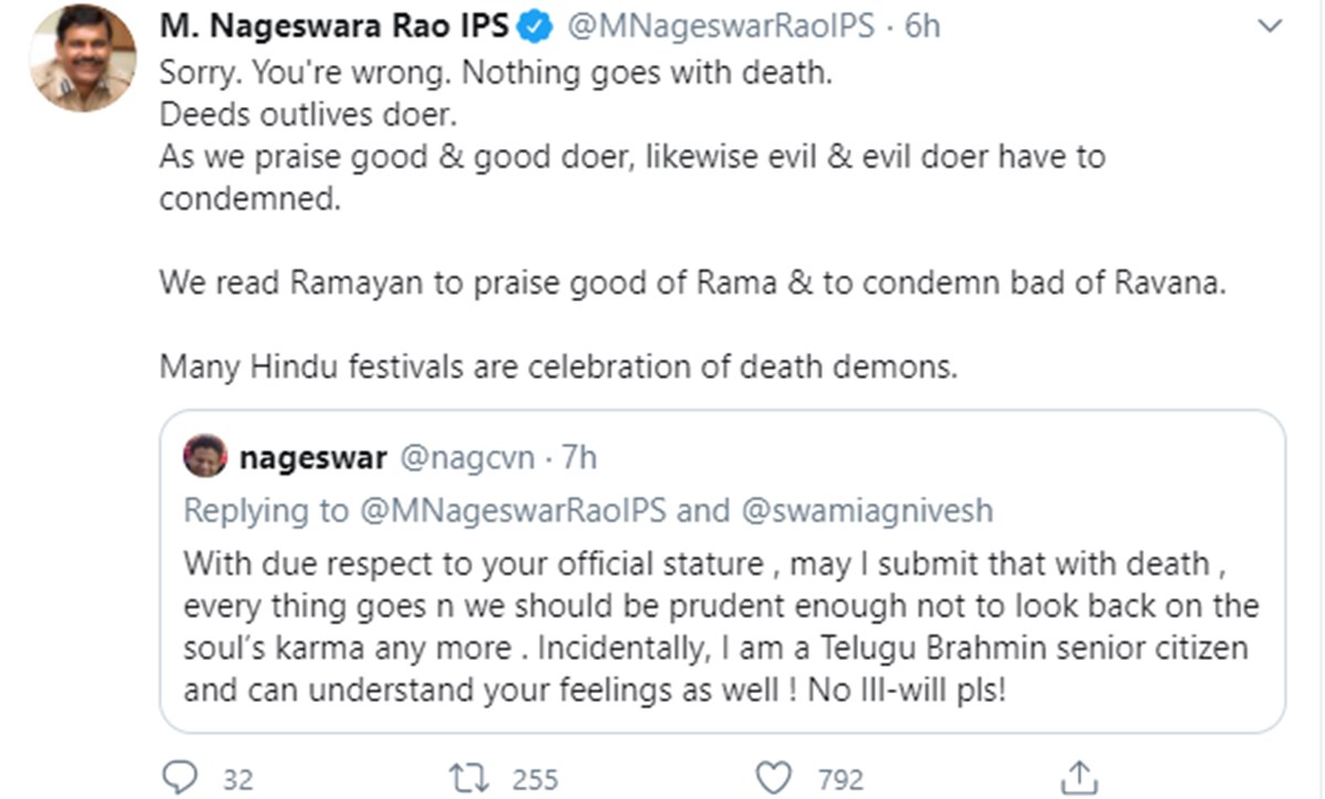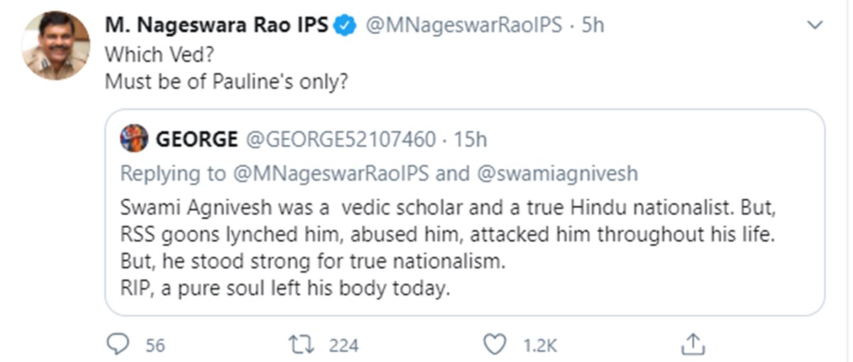 स्वामी अग्निवेश के निधन पर एम.नागेश्व राव ने ट्वीट करते हुए लिखा कि “स्वामी अग्निवेश से अच्छा छुटकारा मिला। तुम भगवा वस्त्रों में एक हिंदू विरोधी थे। तुमने हिदुत्व को बहुत नुकसान पहुंचाया। मुझे शर्म आती है कि तुम एक तेलगू ब्राह्मण पैदा हुए थे। भेड़ की खाल में शेर। मेरी यमराज से शिकायत है कि उन्होंने इतना इंतजार क्यों किया!”