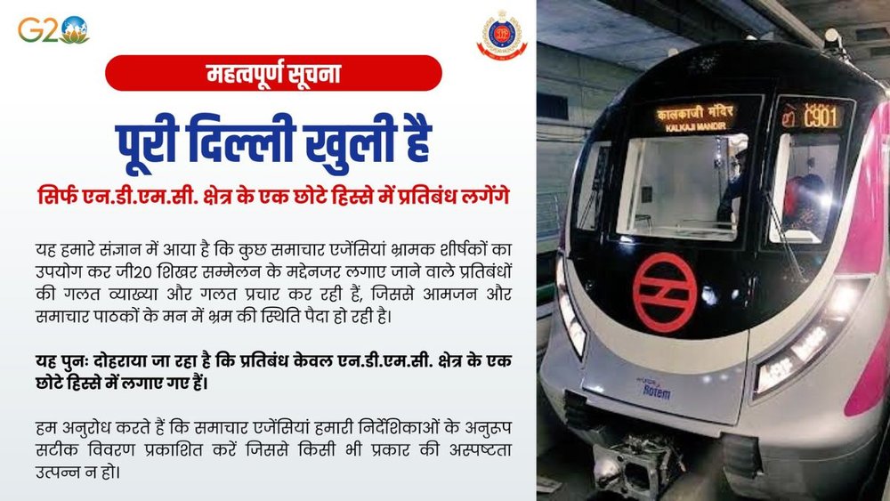 दिल्ली पुलिस द्वारा X पर शेयर की गई जानकारी में कहा गया है कि पूरी दिल्ली खुली है। सिर्फ NDMC क्षेत्र के एक छोटे हिस्से में प्रतिबंध लगेंगे। दिल्ली पुलिस ने बताया कि उनके संज्ञान में आया है कि कुछ समाचार एजेंसियां भ्रामक शीर्षकों का इस्तेमाल कर G20 समिट के मद्देनजर लगाए जाने वाले प्रतिबंधों की गलत व्याख्या और गलत प्रछार कर रही हैं, जिससे लोगों में भ्रम की स्थिति पैदा हो रही है। दिल्ली पुलिस ने ऐसे में कहा कि प्रतिबंध सिर्फ NDMC के एक छोटे से हिस्से में लगाए गए हैं।