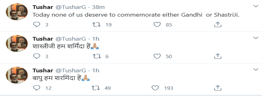 इससे पहले, महात्मा गांधी और लाल बहादुर शास्त्री की जयंती पर शुक्रवार को तुषार गांधी ने ट्वीट किया कि आज हम में से किसी को भी गांधी या फिर शास्त्री की का नाम लेने का हक नहीं है।