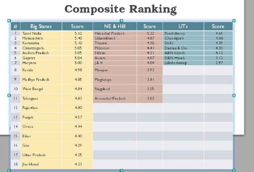 बीजेपी शासित कई राज्य सबसे निचले पायदान पर हैं। हालांकि, कर्नाटक तीसरे स्थान पर अपनी मौजूदगी दर्ज कराने में कामयाब रहा। मसलन समग्र सूचकांक में तमिलनाडु पहले स्थान पर जबकि महाराष्ट्र दूसरे, कर्नाटक तीसरे, छत्तीसगढ़ चौथे, आंध्र प्रदेश पांचवें स्थान पर है। कम्पोजिट लिस्ट में सबसे निचले पायदान पर गोवा, झारखंड और उत्तर प्रदेश हैं।