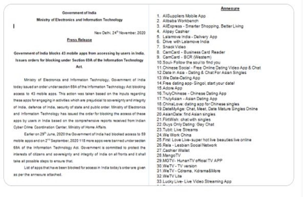 इलेक्ट्रोनिक्स और सूचना तकनीक मंत्रालय ने कहा कि इस बात की सूचना मिली थी कि भारतीय यूजर्स द्वारा यूज किए जा रहे ये ऐप्स देश की संप्रभुता और अखंडता, देश की रक्षा और सुरक्षा के प्रतिकूल कार्रवाई में शामिल थे। इन ऐप्स के संबंध में केंद्रीय गृह मंत्रालय के तहत इंडियन साइबर कोऑर्डिनेशन सेंटर को व्यापक रिपोर्ट मिली थी। इससे पहले केंद्र सरकार ने इस साल 29 जून को TikTok, UC Browser समेत 59 मोबाइल ऐप और 2 सितंबर को 118 मोबाइल ऐप्स पर बैन लगाया था।