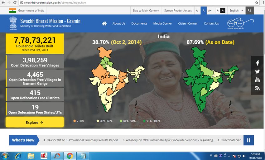 सरकारी दावा: स्वच्छ भारत मिशन- ग्रामीण की सरकारी वेबसाइट पर उपलब्ध आंकड़ों के मुताबिक 16 जुलाई, 2018 की शाम 5 बजकर 35 मिनट तक कुल 3 लाख 98 हजार 259 गांव खुले में शौच से मुक्त (ओडीएफ) करार दिए जा चुके हैं। इनमें से 4,465 गांव नमामि गंगे प्रोजेक्ट के तहत ओडीएफ करार दिए गए हैं। ओडीएफ जिलों की संख्या बढ़कर 415 हो गई है और इसी तरह ओडीफ राज्यों की संख्या 19 हो गई है। ओडीएफ पंचायतों की संख्या 1 लाख 76 हजार 96 और प्रखंडों की संख्या 4,042 हो गई है। इसी वेबसाइट पर दर्ज आंकड़े बताते हैं कि 2 अक्टूबर, 2014 यानी जब प्रधानमंत्री ने स्वच्छ भारत अभियान की शुरुआत की थी, तब देश में मात्र 38.70 फीसदी घरों में ही शौचालय थे जो अब बढ़कर 87.69 फीसदी घरों में बन चुका है। यानी कुल 7 करोड़ 78 लाख 74 हजार 522 घरों में शौचालय बन चुका है। सरकारी आंकड़े बताते हैं कि अंडमान निकोबार, आंध्र प्रदेश, अरुणाचल प्रदेश, चंडीगढ़, छत्तीसगढ़, राजस्थान, हिमाचल प्रदेश, पंजाब, हरियाणा, आंध्र प्रदेश, केरल, महाराष्ट्र, गुजरात में 100 फीसदी घरों में शौचालय बन गए हैं। बिहार, ओडिशा, यूपी, असम और तेलंगाना अभी पीछे है।