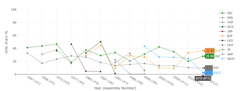 हरियाणा विधानसभा चुनाव में लड़ी हुई सीटों पर पार्टीवार वोट शेयर