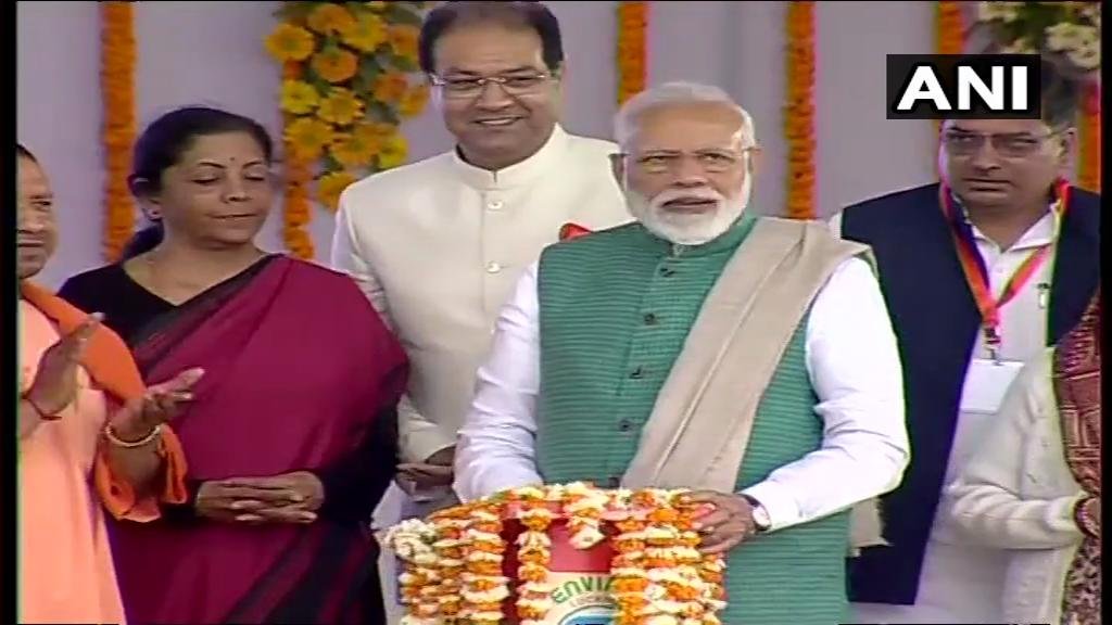 यूपी के अमेठी में रविवार को विभिन्न विकास परियोजनाओं का शिलान्यास करते हुए पीएम मोदी।