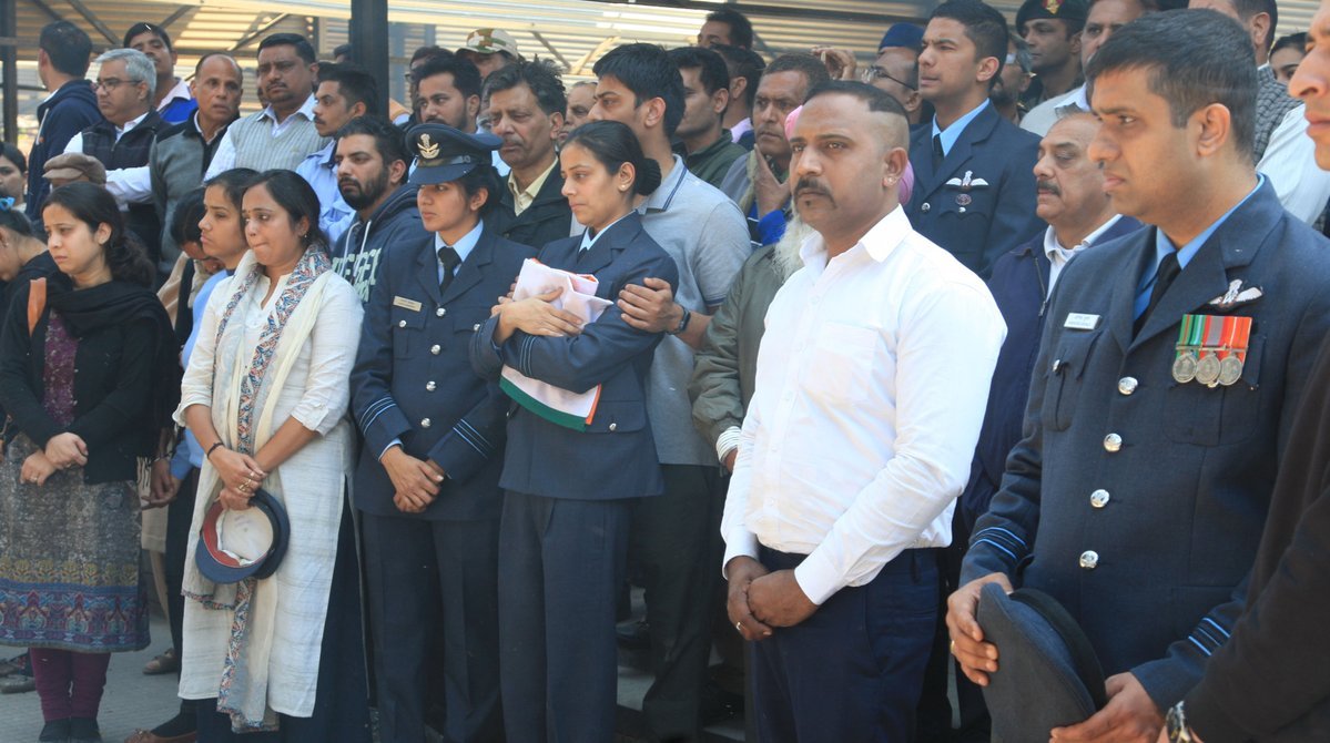 स्क्वॉड्रन लीडर सिद्धार्थ वशिष्ठ का शुक्रवार को चंडीगढ़ में अंतिम संस्कार हुआ। वह Mi-17 हेलीकॉप्टर के पायलट थे, जो कि जम्मू-कश्मीर के बडगाम में 27 फरवरी को क्रैश हो गया था। तस्वीर में तिरंगा लिए हुए उनकी पत्नी स्कवॉड्रन लीडर आरती सिंह।
