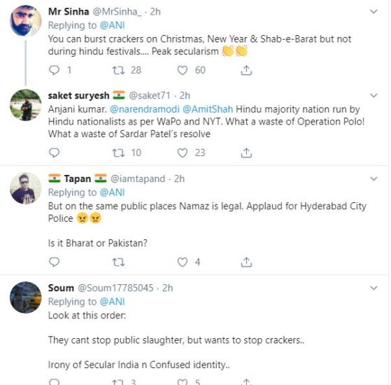 एक ट्विटर यूजर सिन्हा ने नाराजगी जाहिर करते हुए कहा, ‘आप क्रिसमस, नए साल और शब-ए-बारात पर पटाखे फोड़ सकते हैं लेकिन हिन्दू त्योहारों के दौरान नहीं। धर्मनिरपेक्षता चोटी पर पहुंच गई है।’ तापन लिखते हैं, ‘मगर उन्हीं सार्वजनिक स्थानों पर नमाज पढ़ना कानूनी है। हैदराबाद पुलिस की सराहना करता हूं। यह भारत है या पाकिस्तान?’