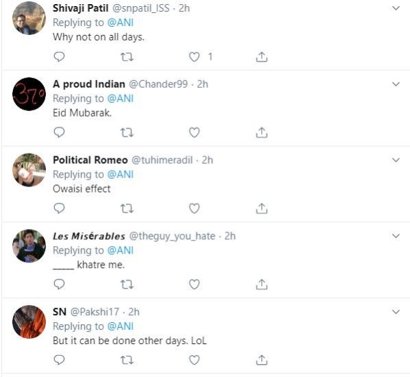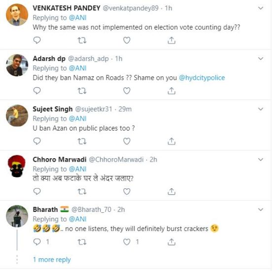 आदर्श नाम के ट्विटर यूजर गुस्सा जाहिर करते हुए कहते हैं क्या उन्होंने सड़क पर नमाज पढ़ने पर प्रतिबंध लगाया? हैदराबाद पुलिस के लिए शर्म की बात है। सुजीत सिंह लिखते हैं, ‘सार्वजनिक स्थानों पर अजान पर भी प्रतिबंध लगे।’ छौरे मारवाड़ी नाम के यूजर ने लिखा, ‘तो क्या अब पटाखे घर के अंदर जलाएं?’