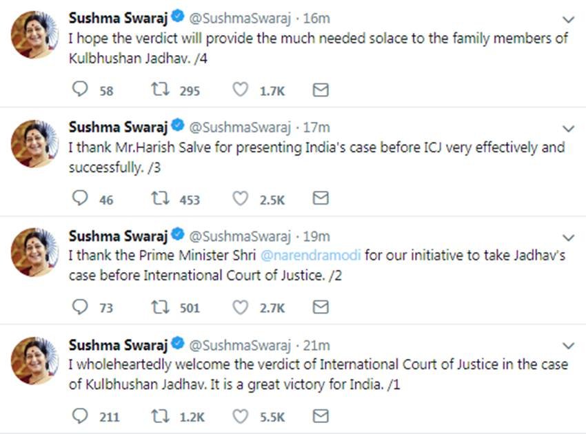 पूर्व विदेश मंत्री और वरिष्ठ बीजेपी नेता सुषमा स्वराज ने कुलभूषण पर फैसला पढ़े जाने के बीच ट्वीट कर कहा- हम आईसीजे के निर्णय का स्वागत करते हैं। यह भारत के लिए बड़ी जीत है। मैं जाधव का मामला आईसीजे में ले जाने के लिए पीएम मोदी को धन्यवाद देती हूं। साथ ही हरीश साल्वे को भी इस मामले में देश का प्रतिनिधित्व करने के लिए बधाई देती हूं। मुझे लगता है कि इस फैसले से कुलभूषण के परिजन को सांत्वना मिलेगी।