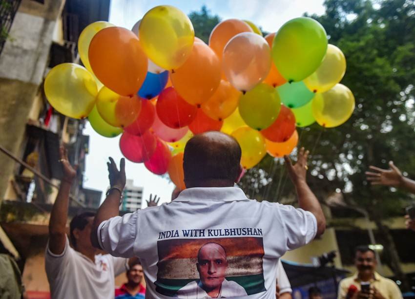 कुलभूषण जाधव केस में आईसीजे का फैसला आने के बाद बुधवार को मुंबई में गुब्बारों के साथ यूं खुशी का इजहार करते जाधव के समर्थक। (फोटोः पीटीआई