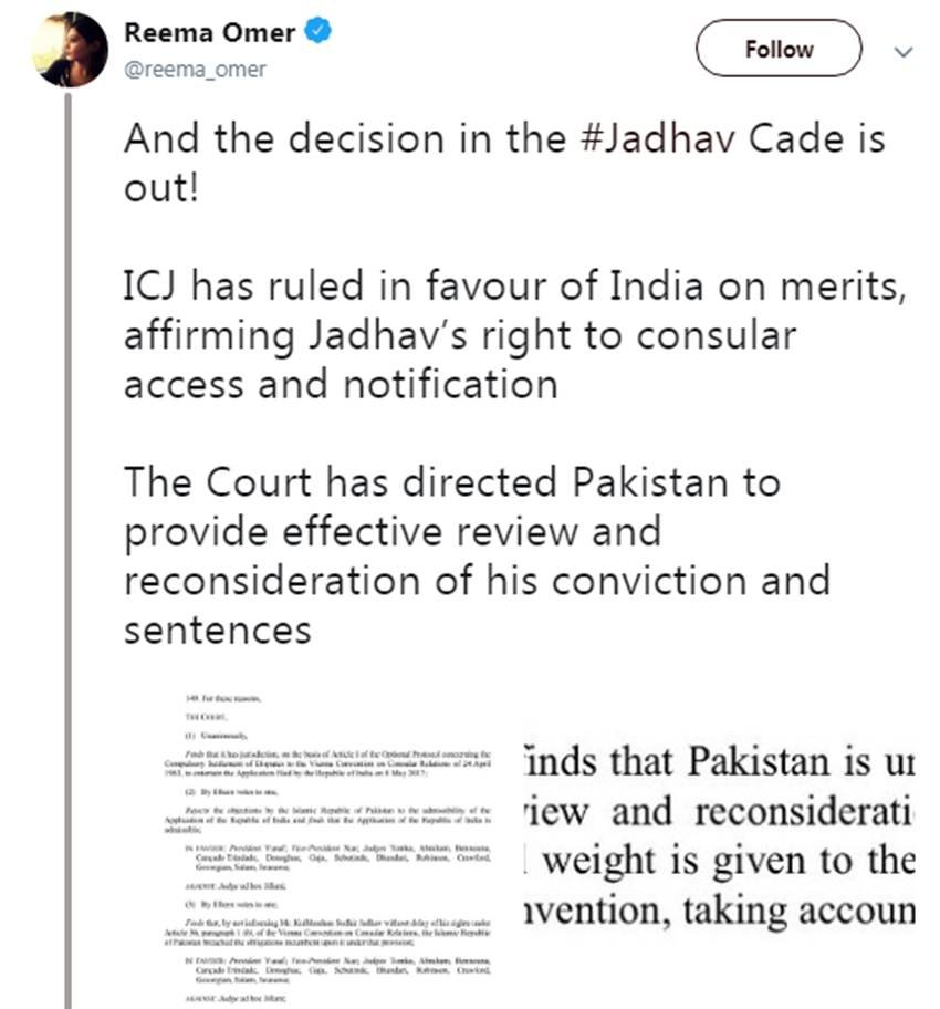 आधिकारिक फैसला आने से पहले आईसीजे में दक्षिण एशियाई मामलों की अंतर्राष्ट्रीय कानूनी सलाहकार रीमा उमर ने इस बारे में ट्वीट कर कहा था कि इस मामले में भारत के पक्ष में फैसला गया है। उनके ट्वीट के अनुसार, कुलभूषण की सजा के फैसले पर पुर्नविचार होगा। भारत को कॉन्सुलर का एक्सेस मिलेगा। ऐसे में आईसीजे में यह पाकिस्तान के लिए तगड़ा झटका माना जा रहा है। आईसीजे के फैसले के बाद कोर्ट परिसर के बाहर जीत के जश्न में नारे भी लगे।
