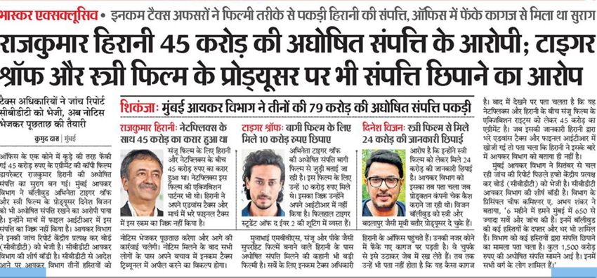 दरअसल हुआ ये कि बुधवार 17 अप्रैल को दैनिक भास्कर ने लिखा था कि, ‘एक रिपोर्ट के मुताबिक आयकर विभाग के अधिकारी जब सर्वे के लिए हिरानी के ऑफिस पहुंचे तो उन्हें एक बेकार पड़ा कागज दिखा जिसे उन्होंने बिना किसी की नजरों में आए ही उठा लिया। जब बाद में इस कागज को देखा गया तो इसमें नेटफ्लिक्स और संजू फिल्म को लेकर एक्जिबिशन राइट्स की 45 करोड़ की रकम का जिक्र था। इसके बाद जब अधिकारियों ने हिरानी की इनकम टैक्स रिटर्न (आईटीआर) से जुड़ी जानकारियों से इसका मिलान किया तो उन्हें कहीं भी इसकी जानकारी नहीं मिली। अधिकारियों को समझ आ गया कि हिरानी ने विभाग को इस संपत्ति की जानकारी नहीं दी है। जिसके बाद आयकर विभाग ने इसकी जांच रिपोर्ट केंद्रीय प्रत्यक्ष कर बोर्ड (सीबीडीटी) को भेज दी।’
