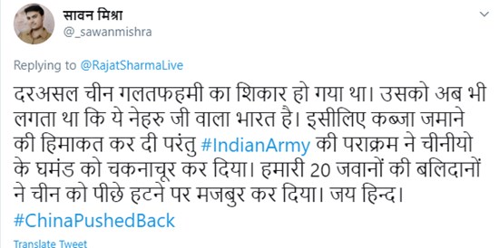 इसी तरह एक अन्य यूजर ने भी भारतीय सेना की तारीफ करते हुए लिखा कि हमारे 20 जवानों के बलिदान ने चीन को पीछे हटने पर मजबूर कर दिया है। एक यूजर ने लिखा कि “इतिहास के पटल पर मोदी सरकार का राष्ट्रवादी युग स्वर्णिम काल के रूप में लिखा जाएगा।”