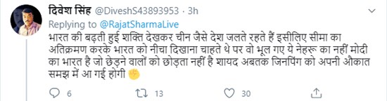 वहीं एक यूजर ने लिखा कि ‘चीनी को हम पानी में घोल घोल पी जाएंगे।’ एक अन्य यूजर ने लिखा कि ‘गलवान घाटी पॉइंट 14 से पीएलए 2 किलोमीटर पीछे हटी और चीन ने अपना अस्थाई विवादित ढांचा भी गिराया और चीनी सेना अपने मूल जगह पर लौट गई..इसी को कहते हैं नया भारत’। एक यूजर ने लिखा कि “भारत की बढ़ती हुई शक्ति देखकर चीन जैसे देश जलते रहते हैं, इसलिए सीमा का अतिक्रमण करके भारत को नीचा दिखाना चाहते थे पर वो भूल गए ये नेहरू का नहीं मोदी का भारत है जो छेड़ने वालों को छोड़ता नहीं है शायद अब तक जिनपिंग को अपनी औकात समझ में आ गई होगी।”
