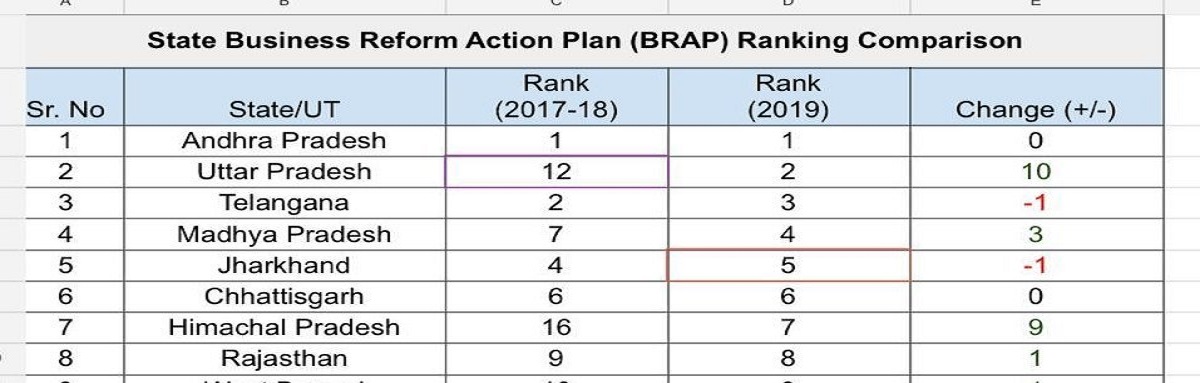 कारोबार सुधार कार्रवाई योजना के तहत उद्योग एवं आंतरिक व्यापार संवर्द्धन विभाग सभी राज्यों और संघ शासित प्रदेशों के लिए इस प्रकिया को पूरा करता है। पिछली रैंकिंग जुलाई, 2018 में जारी हुई थी। उस समय आंध्र प्रदेश पहले स्थान पर रहा था। उसके बाद क्रमश: तेलंगाना और हरियाणा का स्थान रहा था। (भाषा इनपुट्स के साथ)
