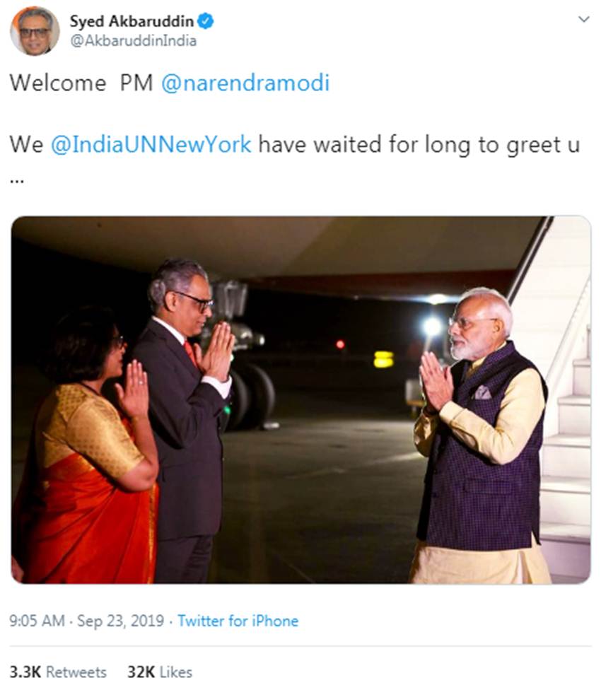 अकबरुद्दीन ने सोमवार (23 सितंबर, 2019) सुबह इसी बाबत एक ट्वीट किया। एयरपोर्ट पर पीएम मोदी के स्वागत के दौरान का फोटो शेयर करते हुए उन्होंने इस ट्वीट में लिखा, “पीएम मोदी आपका स्वागत है। न्यू यॉर्क स्थित यूनाइटेड नेशंस में परमानेंट मिशन ऑफ इंडिया के लोगों ने आपके स्वागत के लिए काफी घंटों इंतजार किया।”