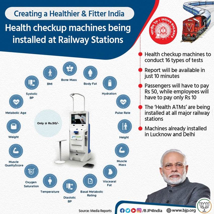 Indian Railways, IRCTC: यात्रियों के लिए रेलवे ने बड़ा कदम उठाया है। अब रेल यात्री रेलवे स्टेशन पर अपने सेहत की जांच कर सकेंगे। बीजेपी के ट्विटर हैंडल से एक ट्वीट किया गया है। जिसमें लिखा गया है फिटर इंडिया = बेटर इंडिया। बीजेपी के इस ट्वीट में बताया गया है कि रेलवे स्टेशनों पर रेल यात्रियों और रेलवे सेवा से जुड़े लोगों के लिए हेल्थ एटीएम लगाए जा रहे हैं जिससे आपको 16 प्रमुख रिपोर्ट 10 मिनट में केवल पचास रुपए में लोगों को पता चल सकेगी।