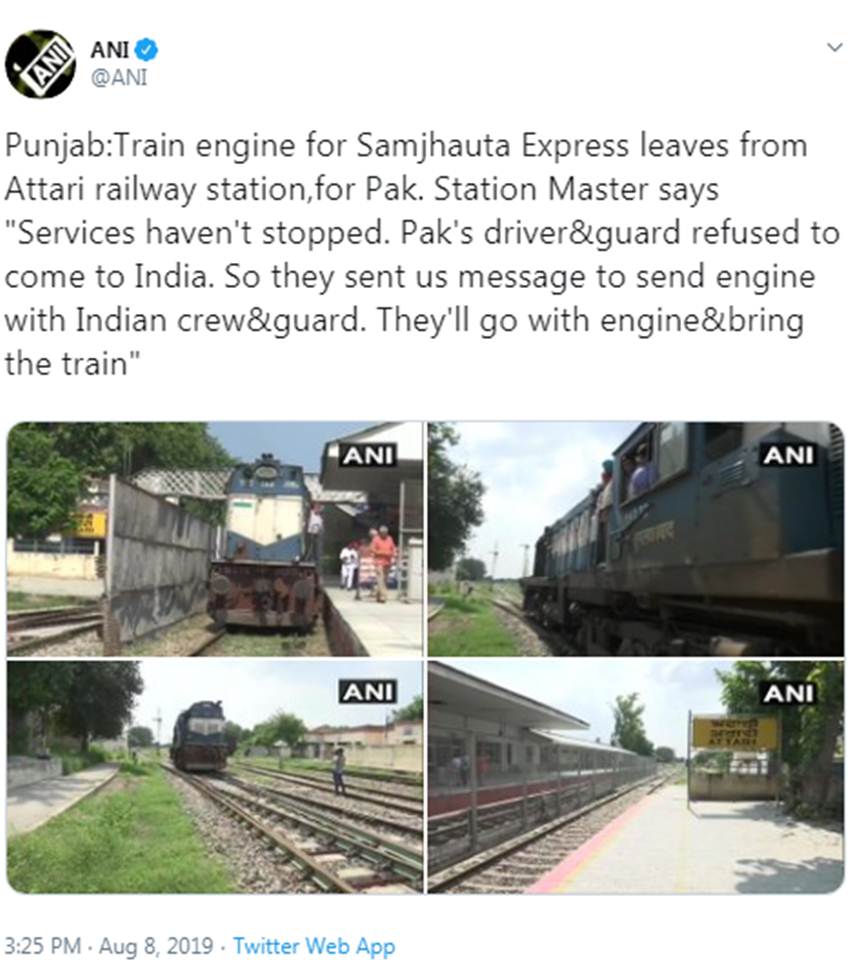 बकौल सीपीआरओ, “ट्रेन फिलहाल वाघा की ओर है, जिसमें 110 यात्री हैं। हम ट्रेन और यात्रियों को वाघा से अटारी लेकर आएंगे, जबकि पाक जाने वाले 70 यात्री यहां इंतजार कर रहे हैं। ऐसे में यह कहना गलत है कि ट्रेन सेवा रद्द कर दी गई है।”