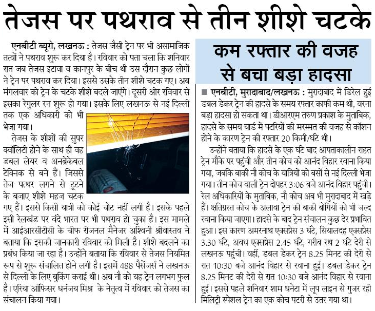 IRCTC Tejas express: लखनऊ से दिल्ली के बीच चलने वाली बहुप्रतिक्षित और पहली कॉरपोरेट हाईस्पीड ट्रेन ‘तेजस एक्सप्रेस’ पटरी पर उतरते ही पत्थरबाजों के निशाने पर आ गई। नव भारत टाइम्स की रिपोर्ट के मुताबिक शनिवार रात ट्रेन जब इटावा और कानपुर के बीच थी तभी कुछ असामाजिक तत्वों ने ट्रेन पर पथराव कर दिया। इस घटना के एक दिन पहले यानी कि 4 अक्टूबर शुक्रवार को ही उत्तर प्रदेश के सीएम योगी आदित्यनाथ ने झंडी दिखाकर ट्रेन का उद्घाटन किया था। ये पहली बार नहीं है जब ऐसा कुछ हुआ है। इससे पहले वंदेभारत एक्सप्रेस में भी पथराव हो चुका है। इस ट्रेन में एक बार नहीं बल्कि दर्जनों बार पथराव हुआ है जिसके चलते अब इस ट्रेन में आरपीएफ का एक दस्ता साथ चलता है।