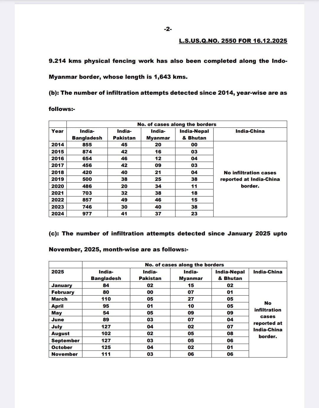दूसरी तरफ बांग्लादेश के साथ भारत कुल 4,096.70 किलोमीटर सीमा शेयर करता है। इसमें से 3,239.92 किलोमीटर (79.08%) पर बाड़ लगाई जा चुकी है, लेकिन 856.778 किलोमीटर यानी 20.92 प्रतिशत हिस्सा अभी भी खुला है। गृह मंत्रालय ने यह भी बताया कि भारत–म्यांमार सीमा (1,643 किलोमीटर) पर अब तक केवल 9.214 किलोमीटर में ही फेंसिंग पूरी हो सकी है।