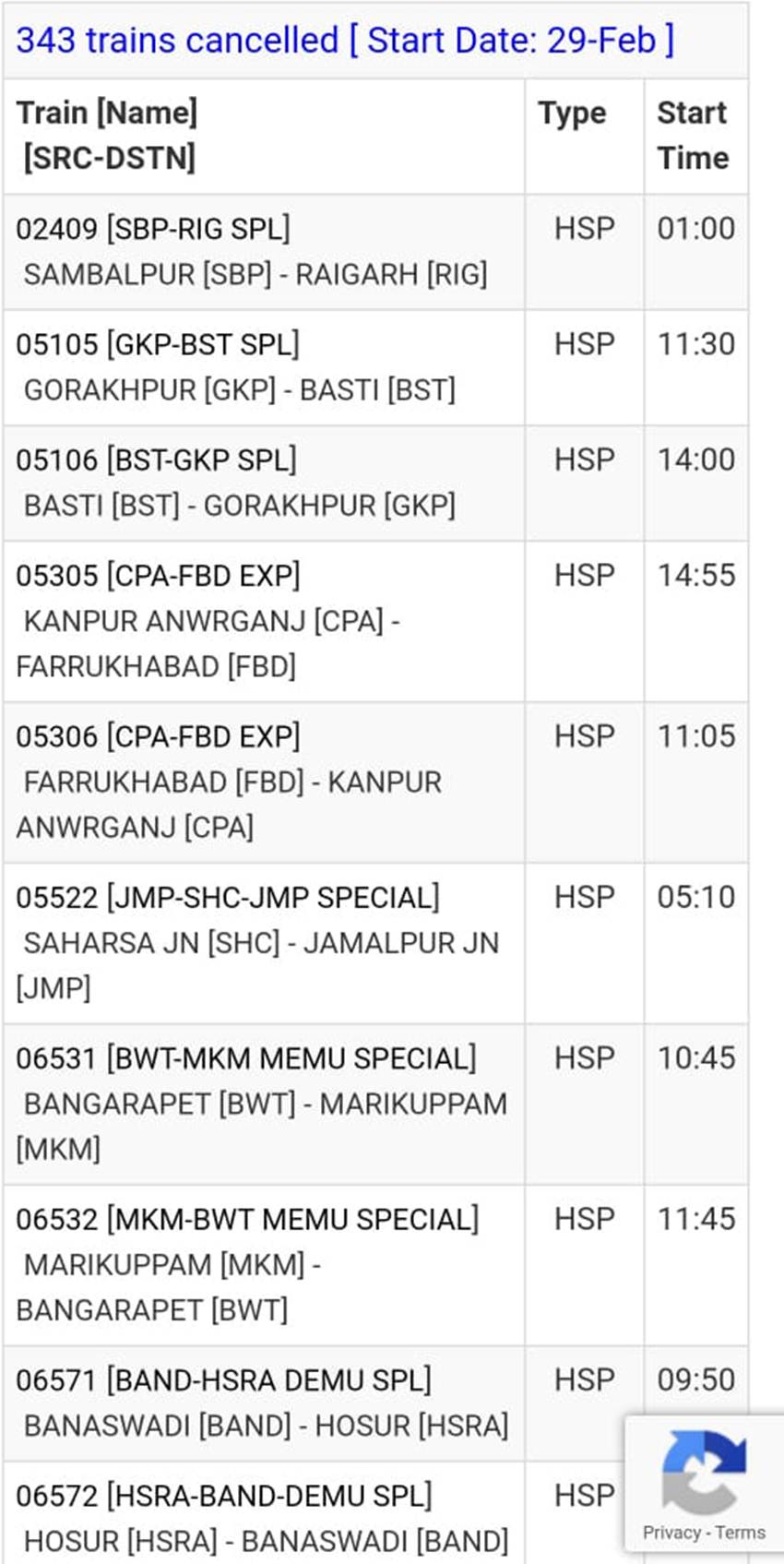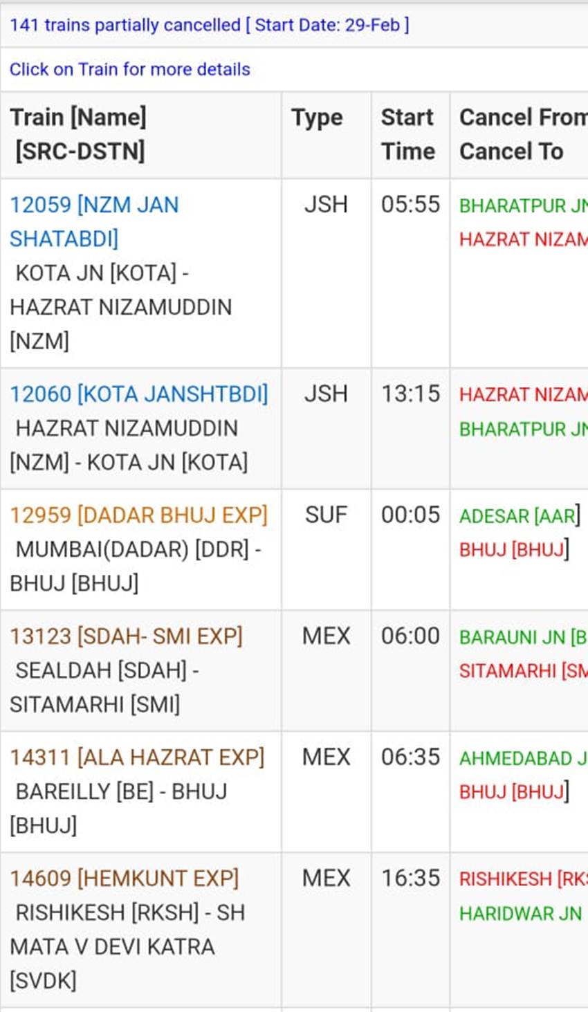 भारतीय रेल ने आज 29 फरवरी को चलने वाली कई ट्रेनें रद्द कर रखी हैं। इनमें 343 कैंसल हैं, जबकि 141 आंशिक रूप से रद्द हैं। यानी कुल 484 गाड़ियों का आवागमन प्रभावित है। ऐसे में हम नीचे ऐसी ही कुछ ट्रेनों का ब्यौरा साझा कर रहे हैं। स्क्रीनशॉट्स में आपको रद्द और आंशिक रूप से रद्द गाड़ियों के डिटेल्स मिलेंगे। मसलन नाम, नंबर और रूट की जानकारी।