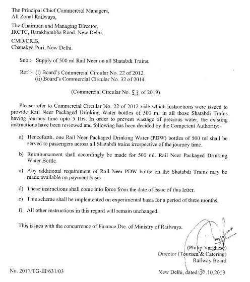500 एमएल की एक रेल नीर की बोतल को सभी शताब्दी ट्रेनों में यात्रियों को परोसा जाएगा। इसके अलावा लोग और पानी खरीद सकते हैं। आईआरसीटीसी ने कहा है कि शताब्दी एक्सप्रेस ट्रेनों में इस व्यवस्था को पायलट प्रोजेक्ट के तौर पर अगले तीन महीनों के लिए लागू किया गया है। अगर ट्रेन का सफर पांच घंटे से ज्यादा का है तो यात्रियों को आधा-आधा लीटर की दो बोतलें दी जाएंगी।