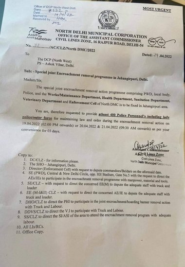 दिल्ली के जहांगीरपुरी में हनुमान जयंती पर भड़की हिंसा के बाद भारतीय जनता पार्टी (भाजपा) शासित एनडीएमसी ने इस इलाके में बुधवार (20 अप्रैल, 2022) अतिक्रमण-रोधी अभियान चलाया। हालांकि, सुप्रीम कोर्ट ने इस बाबत दख ली और यथास्थिति बरकरार रखने का निर्देश दिए। फिर भी वहां कुछ जगहों पर अवैध निर्माण तोड़ने की कार्रवाई जारी रही। एमसीडी ने इस बाबत 400 दिल्ली पुलिस के जवान मांगे थे, ताकि वहां पर कानून- व्यवस्था बरकरार रहे।
