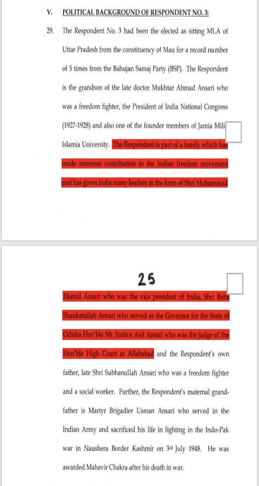 एफिडेविट के मुताबिक, “जवाब देने वाला मऊ सीट से पांच बार का BSP विधायक है। वह दिवंगत डॉक्टर मुख्तार अहमद अंसारी का पोता है, जो कि स्वतंत्रता सेनानी, इंडियन नेशनल कांग्रेस (1927-1928) के अध्यक्ष और नई दिल्ली स्थित जामिया मिल्लिया इस्लामिया (JMI) के संस्थापक सदस्यों में से एक थे। वह ऐसे परिवार से ताल्लुक रखता है, जिसने भारत के स्वतंत्रता आंदोलन में अत्यधिक योगदान दिया था और जिसने देश को पूर्व उपराष्ट्रपति मोहम्मद हामिद अंसारी, तत्कालीन ओडिशा के राज्यपाल बाबा शौकतुल्ला अंसारी, इलाहाबाद हाईकोर्ट के जज जस्टिस आसिफ अंसारी और खुद उत्तरदायी (मुख्तार) के पिता दिवंगत सुभानअल्लाह अंसारी (स्वतंत्रता सेनानी और सामाजिक कार्यकर्ता) सरीखे नेता दिए।
