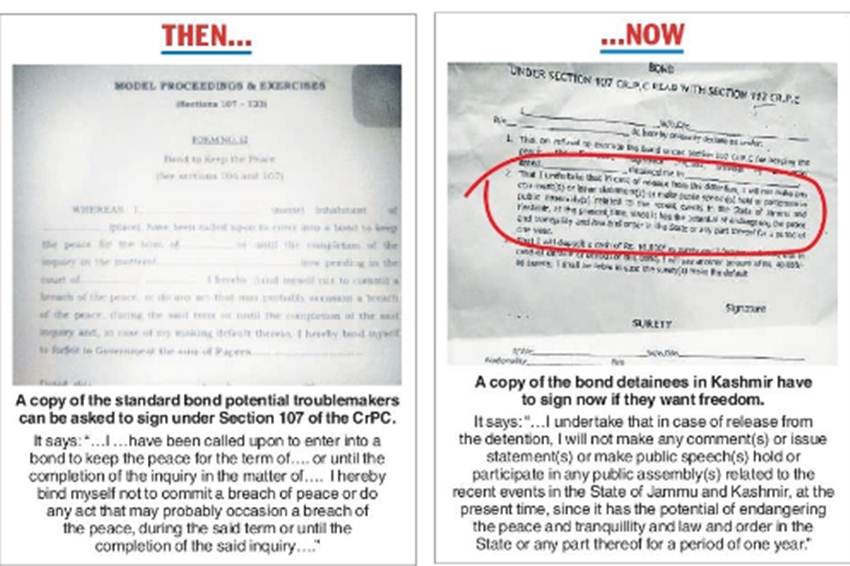 बॉन्ड के मुताबिक, रिहाई के एक साल तक उन्हें अनुच्छेद 370 के खात्मे के खिलाफ मुंह नहीं खोलना है। बता दें कि सरकार पहले भी राजनीतिक बंदियों से इस तरह के बॉन्ड पेपर पर दस्तखत करवाती रही है लेकिन अनुच्छेद 370 के खात्मे के बाद सरकार ने बॉन्ड पेपर के तथ्यों में बदलाव किया है। अपराध दंड विधान संहिता (सीआरपीसी) की धारा 107 के मुताबिक जिलाधिकारी को इसका संवैधानिक अधिकार है कि जिले में शांति-व्यवस्था कायम रखने के लिए किसी भी शख्स से, जिससे उपद्रव होने की आशंका हो, इस तरह के बॉन्ड भरवा सकता है।