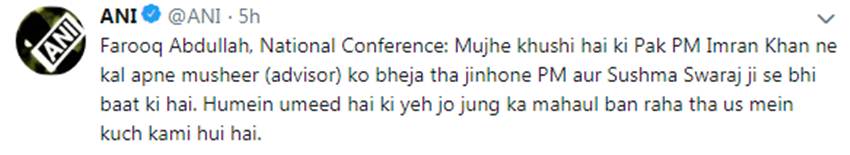 नेशनल कांफ्रेस के नेता और जम्मू-कश्मीर के पूर्व मुख्यमंत्री फारुख अब्दुल्ला ने पाकिस्तान के प्रधानमंत्री की तारीफ की है। एएनआई के अनुसार, उन्होंने कहा, “मुझे खुशी है कि पाक पीएम इमरान खान ने कल अपने मुशीर (सलाहकार) को भेजा था जिन्होंने पीएम और सुषमा स्वराज जी से बात की है। हमें उम्मीद है कि ये जो जंग का माहौल बन रहा था, उसमें कुछ कमी हुई है।” फारुख अब्दुल्ला जम्मू-कश्मीर के पुलवामा में सीआरपीएफ काफिले पर हुए हमले के बाद भारत और पाकिस्तान के बीच बने माहौल को लेकर यह टिप्पणी की। बता दें कि काफिले पर हमले की वजह से सीआरपीएफ के करीब 40 जवान शहीद हो गए थे। इस हमले की जिम्मेदारी पाकिस्तान स्थित आतंकी संगठन जैश ए मोहम्मद ने ली थी। इसके विरोध में पाकिस्तान के खिलाफ कड़ी कार्रवाई करने की मांग उठने लगी थी।
