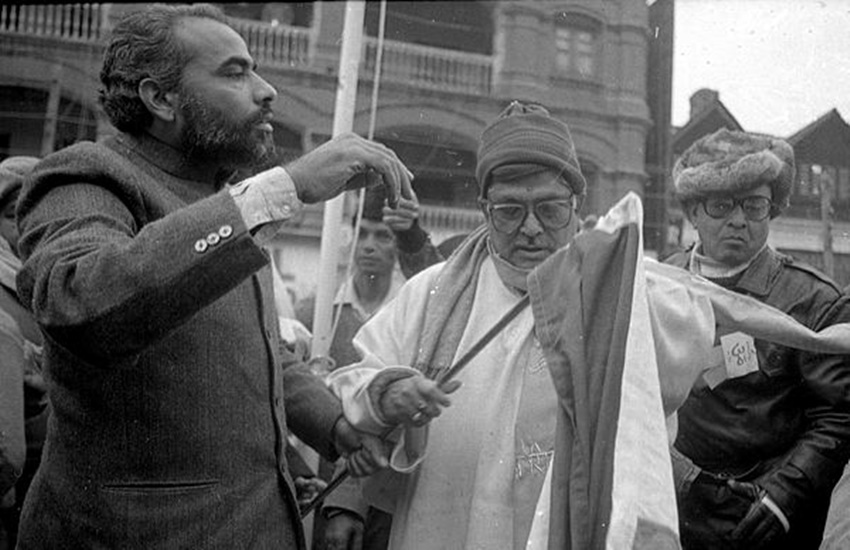 जम्मू-कश्मीर के लाल चौक पर स्वतंत्रता दिवस पर झंडा फहराते मुरलीमनोहर जोशी और नरेंद्र मोदी. एक्सप्रेस फोटो By प्रवीण जैन