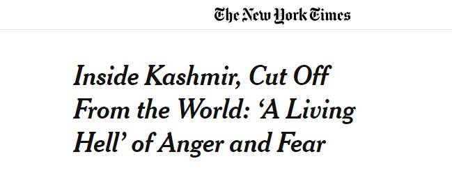 द न्यूयॉर्क टाइम्स के फ्रंट पेज पर पथराव के बाद ईंटों से भरी एक गली की तस्वीर प्रकाशित की गई है। वहीं, अखबार की वेबसाइट पर Inside Kashmir, Cut off From the World: ‘A Living Hell’ of Anger and Fear शीर्षक से एक रिपोर्ट पेश की है। इस रिपोर्ट में बताया गया है कि शनिवार को कश्मीर में घाटी में बड़े पैमाने पर विरोध प्रदर्शन हुए हैं। इस दौरान भारतीय सुरक्षाबलों और स्थानीय लोगों को बीच हिंसक झड़प की भी खबर है। रिपोर्ट के अनुसार, शुक्रवार को भी हजारों की तादाद में लोग सड़कों पर उतरे थे और उनकी सुरक्षाबलों के साथ झड़प भी हुई थी। इस दौरान 7 लोग घायल हुए।